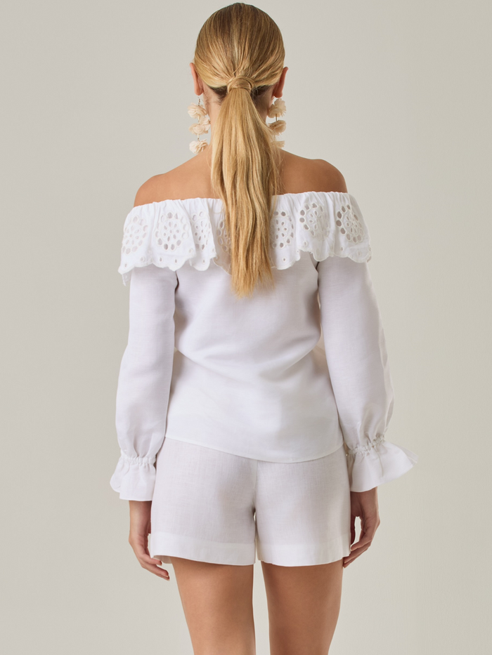 Fresca y femenina, esta blusa corta destaca por sus delicados volantes en el escote y el cuerpo, creando movimiento y suavidad visual. Con mangas largas de puño fruncido y amarre en el escote, es una prenda ideal para looks bohemios y estilismos relajados con un toque romántico. Perfecta para combinar con prendas de tiro alto en ocasiones casuales con estilo.