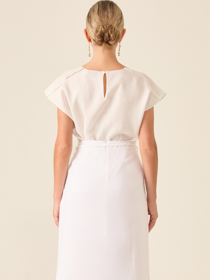 Blusa corta con silueta asimétrica y escote en V profundo. El diseño se cruza en el frente y se asegura con un botón al centro, generando una caída fluida y ligera. Las mangas cortas tipo capa aportan un aire moderno y relajado. Una prenda que combina líneas limpias con un toque contemporáneo.